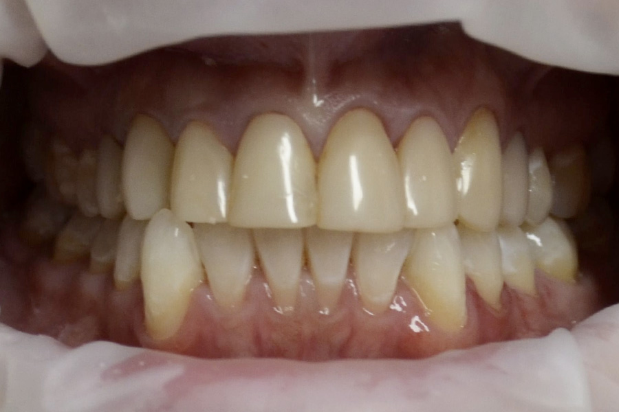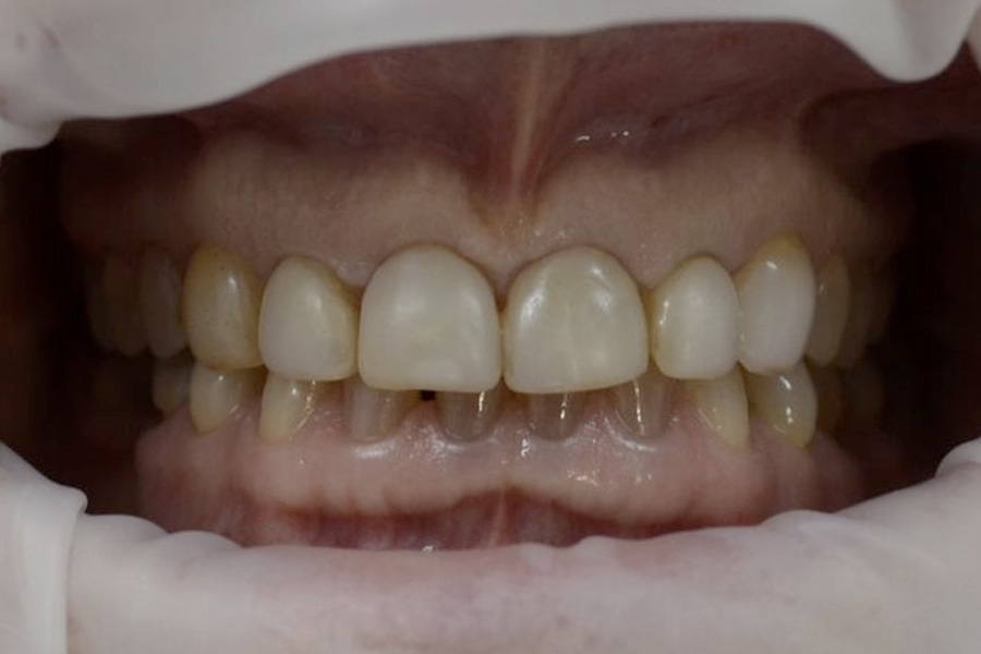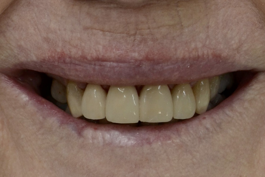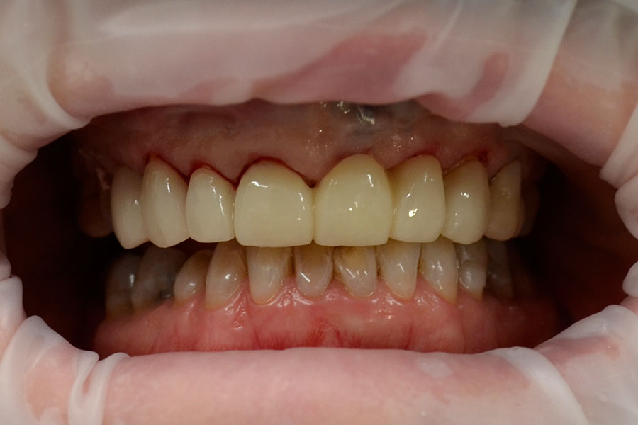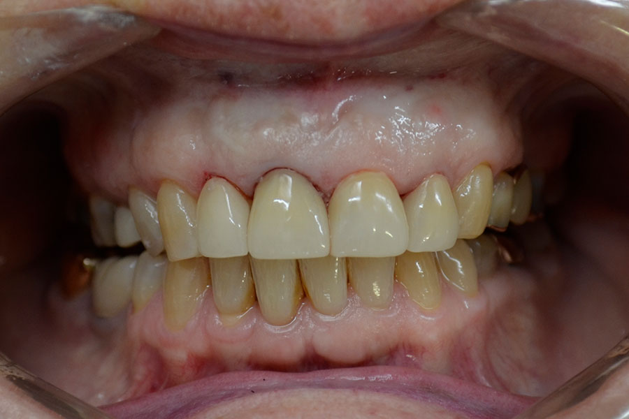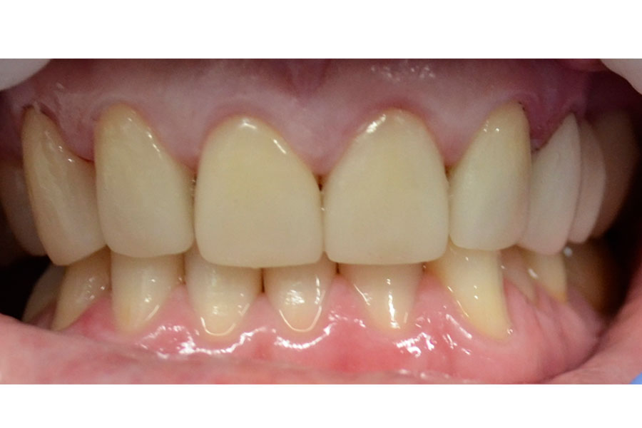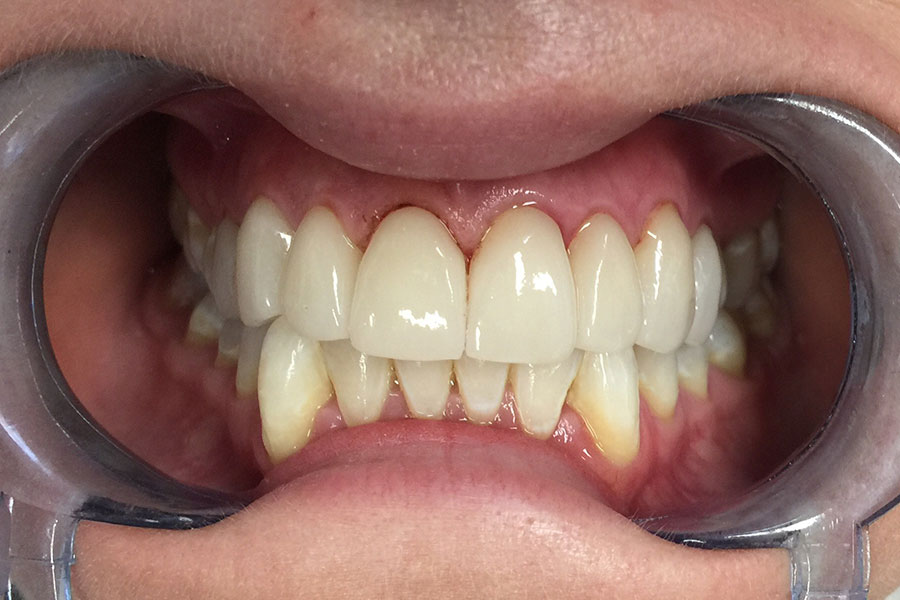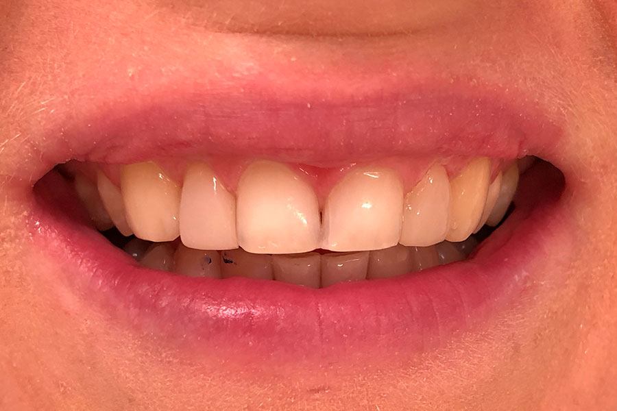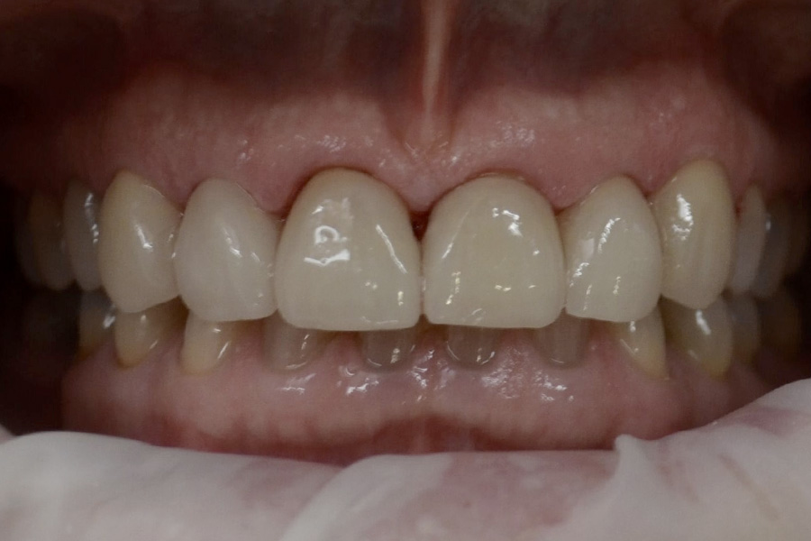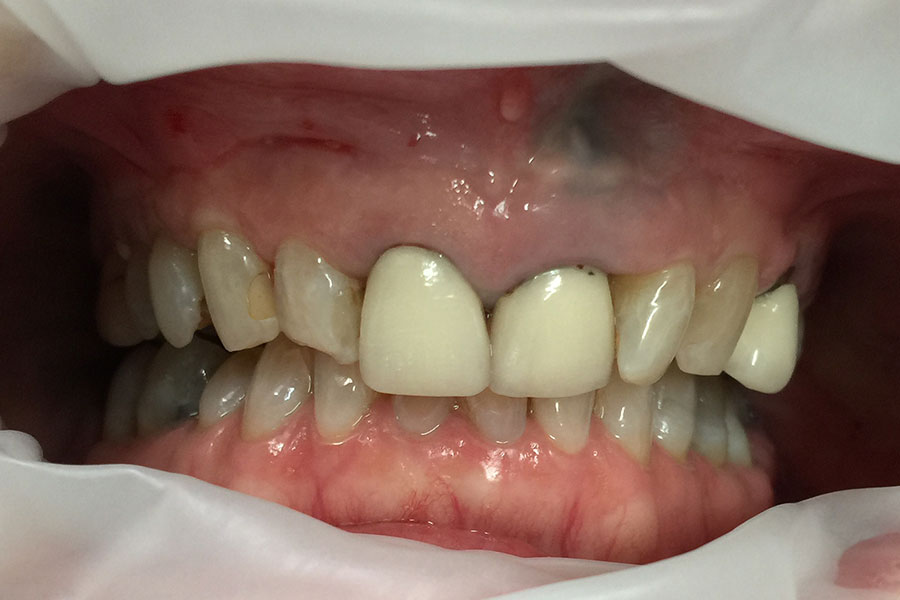 The upper left central incisor was removed and replaced with an all ceramic bridge. Other front teeth received crowns and veneers The new bridge and crown on the central incisors are all ceramic (without any metal on the inside) and blend in more naturally with the veneers.